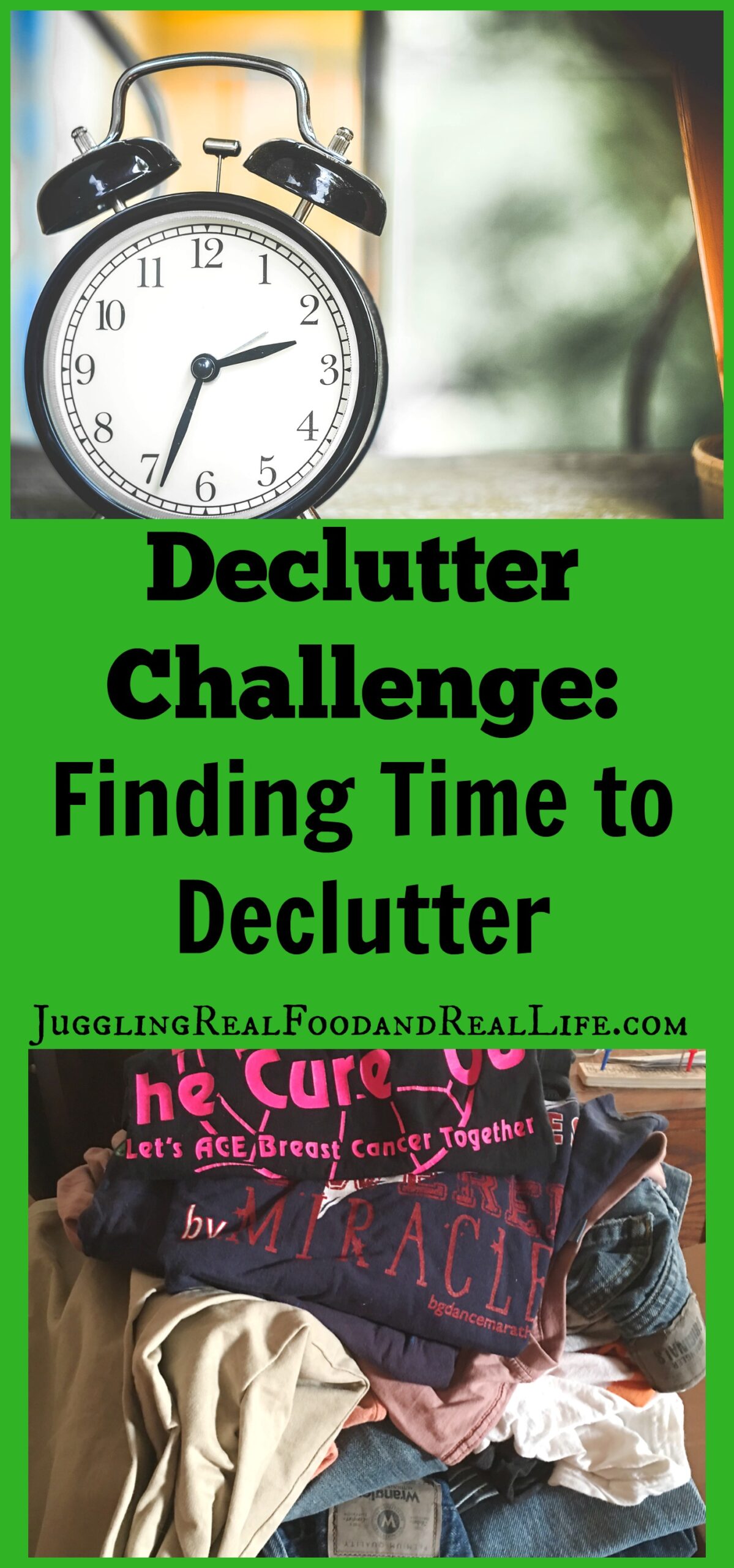 Finding time to declutter is a common problem I hear when I start to talk about decluttering with friends and family. As a busy mom with mountains of laundry and a long list of things to do, it is often difficult to find the time to work on large declutter projects. I would love to spend hours and hours decluttering, but I’ve got to juggle my decluttering along with everything else I do like cooking my family real food, working full-time outside of my home, and all of my kids’ activities. For years and years, I used my “busy-ness” as an excuse for my cluttered home. I wore my crazy schedule as a badge of honor. Finally one day I said, “Enough!” I may not be able to find time in my schedule to declutter large projects all at once, but I could still work on things bit by bit.